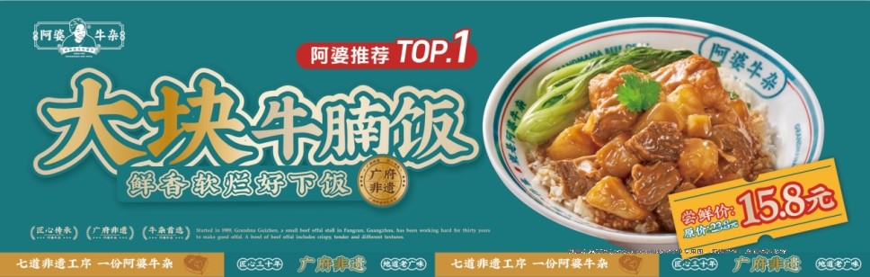 (二)新價格:阿婆牛雜帶著極大的誠意和對廣式美食的傳承精神,主打平價好吃快餐。其中,爆款大塊牛腩飯僅需15.8元,渣渣拌面系列低至9塊9,加上各式小吃,20元左右的價格就能飽到扶墻走。